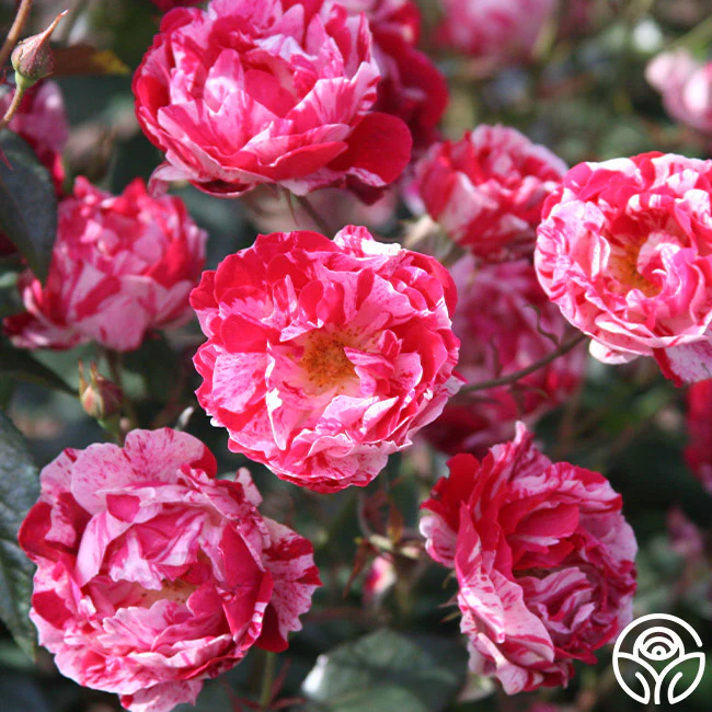 Named for America after September 11, 2001, Stars ‘n’ Stripes Forever™ produces hundreds of striking 2" blooms with 10-16 in sprays. We love using this rose for arrangements to enjoy indoors too! She has a slightly spreading habit and even growth with rich, deep green foliage. Her showy blooms of white and dark pink stripes will command attention for this continually blooming bush.